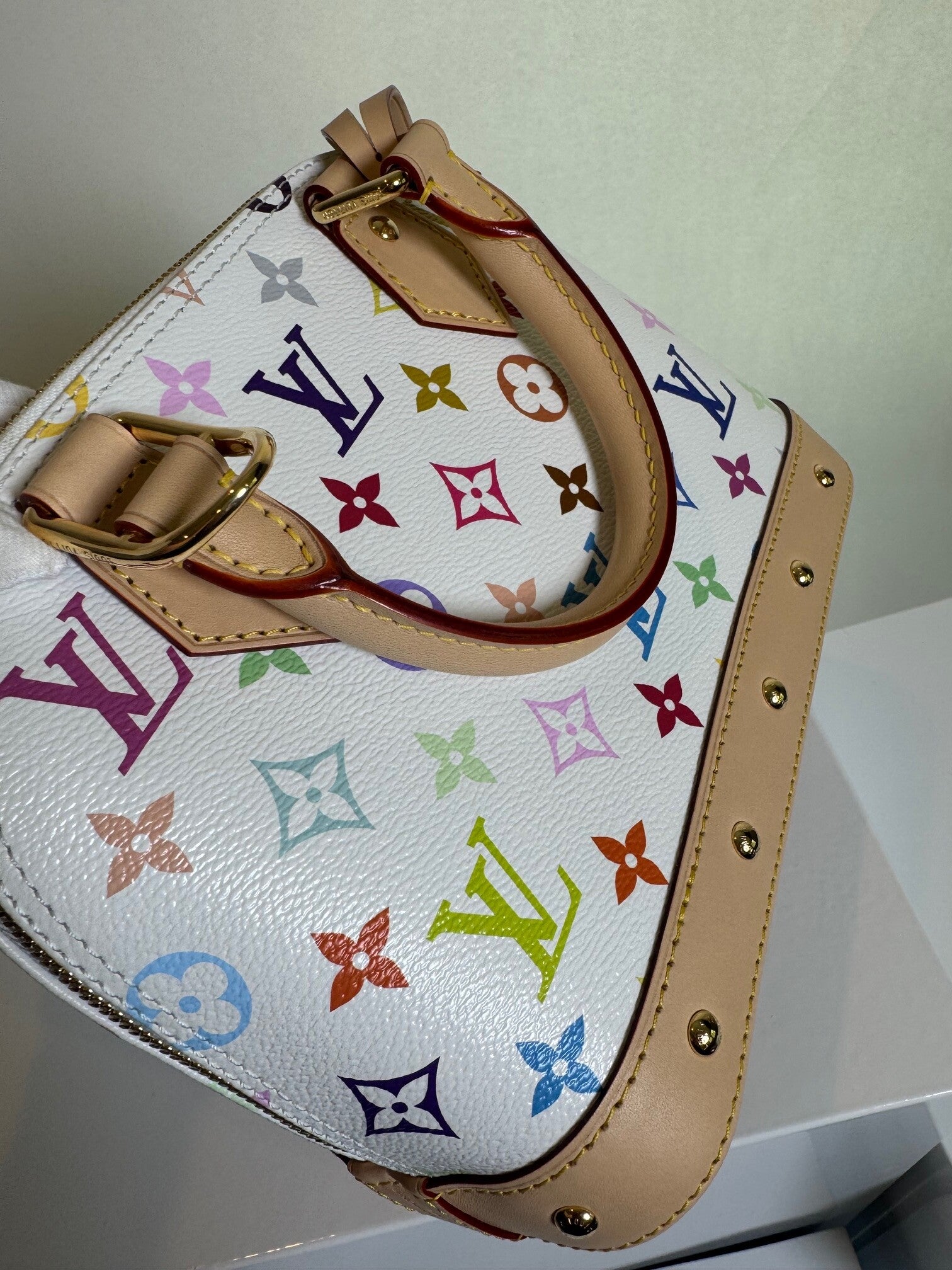 Brand New Louis Vuitton x Alma Bb multicolored monogram coated canvas with cowhide leather trim. This playful color is not only stylish but can be used daily.
