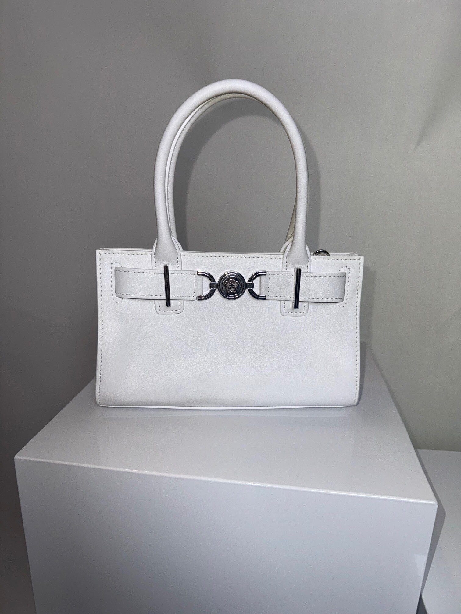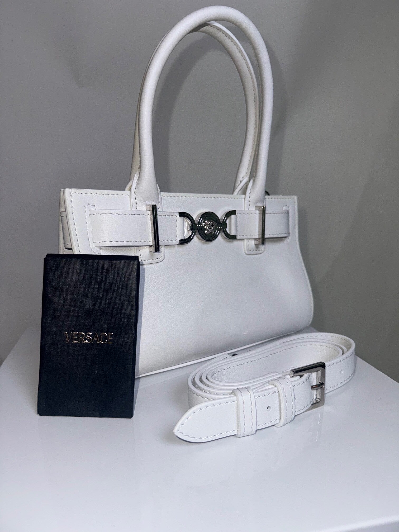 This brand new small tote comes in white leather. This bag can be carried by the handle or as a crossbody. This beautiful piece comes with the dustbag, authentication card, original wrapped straps, and dust bag.
