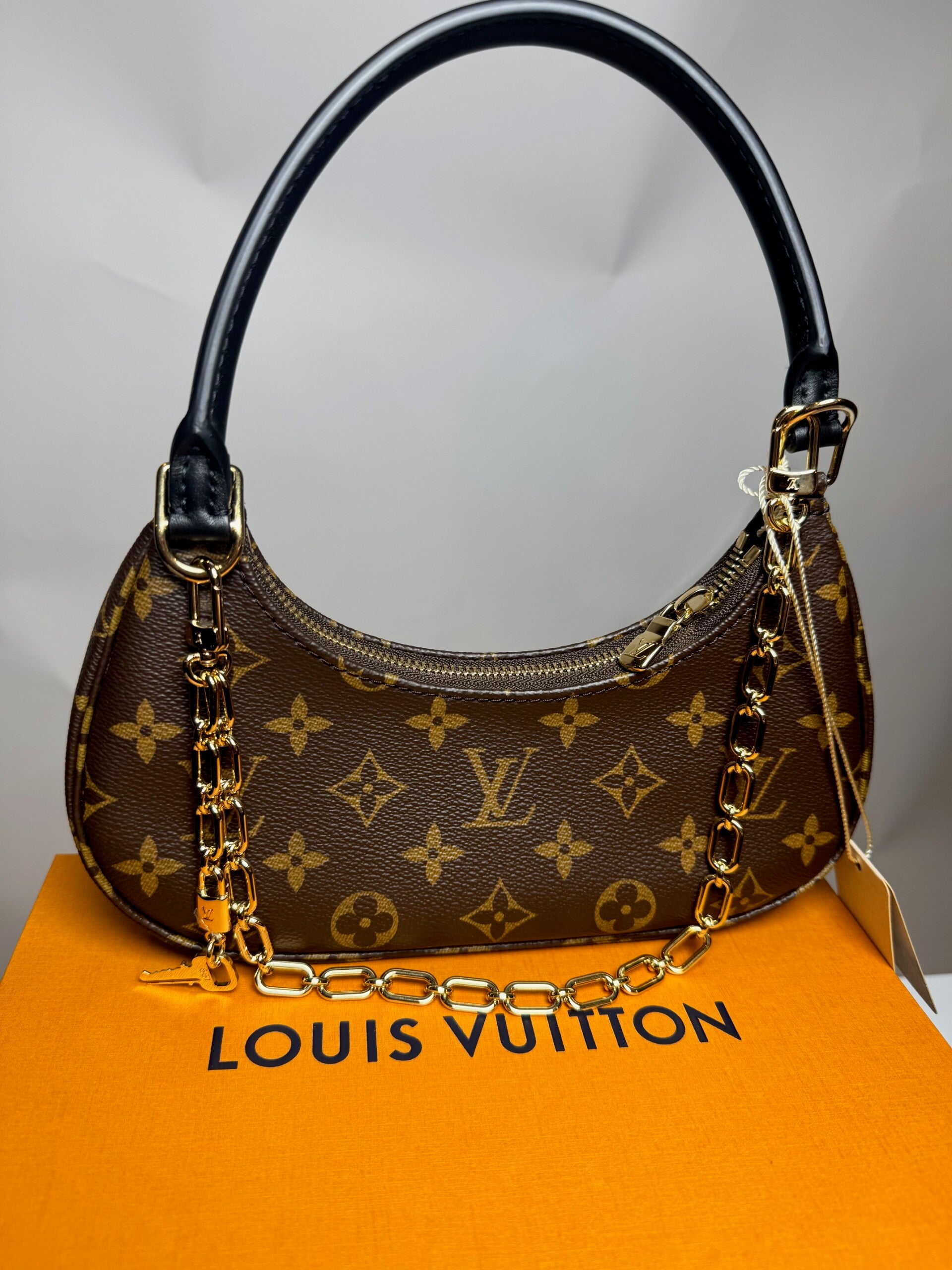 This brand new LV is elevated with cowhide trims and features a removable gold-toned chain adorned with a key-shaped charm. This comes with one handle and a removable shoulder strap to offer carrying versatility.