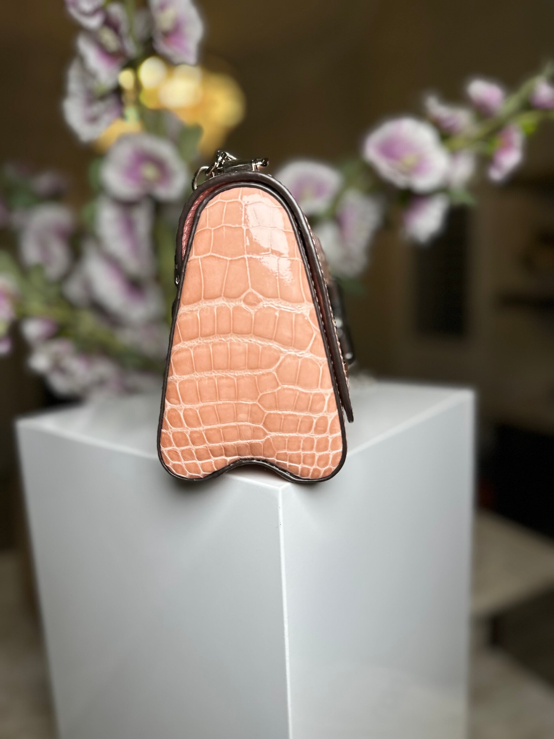 A true masterpiece from Louis Vuitton, this Twist PM is crafted in exotic shiny crocodile leather in a soft blush hue, making it both rare and breathtaking. The bold LV twist-lock closure in polished silver-tone hardware adds a striking modern edge to the timeless design. This bag features a structured flap silhouette, an adjustable chain strap with a crocodile leather shoulder pad, allowing it to be worn crossbody or on the shoulder. Its compact yet spacious interior is perfect for day-to-night transitions, combining elegance with practicality.