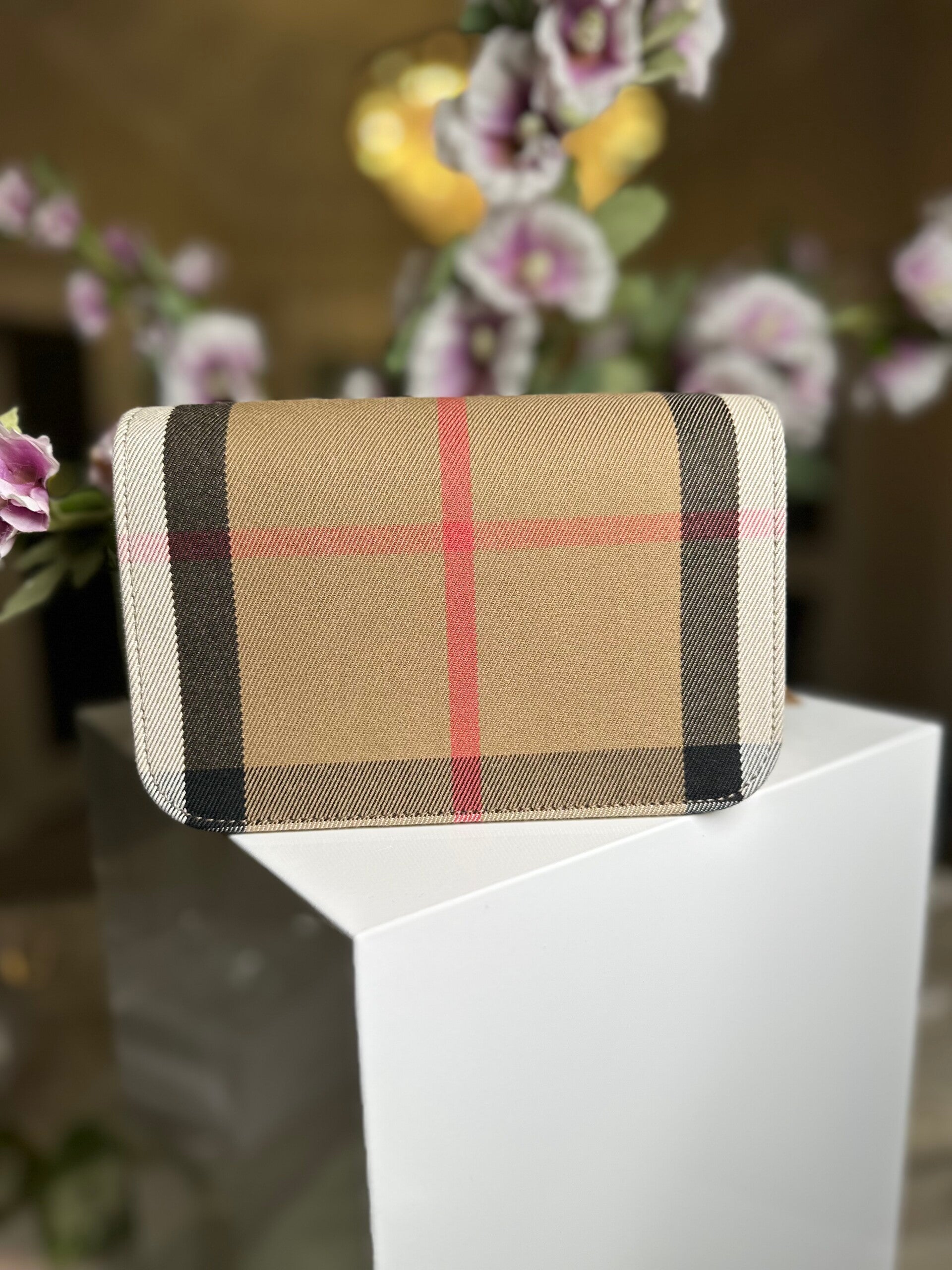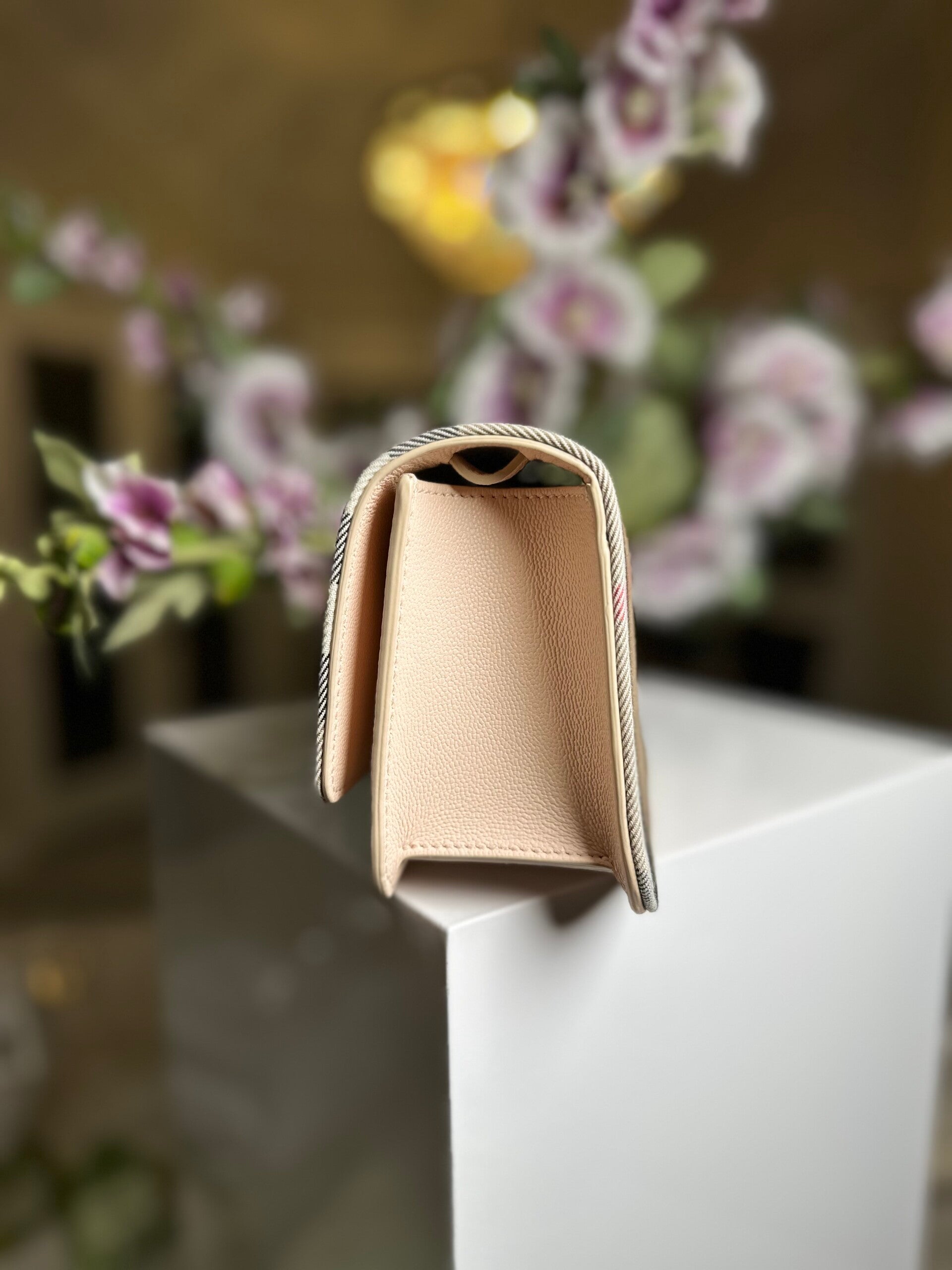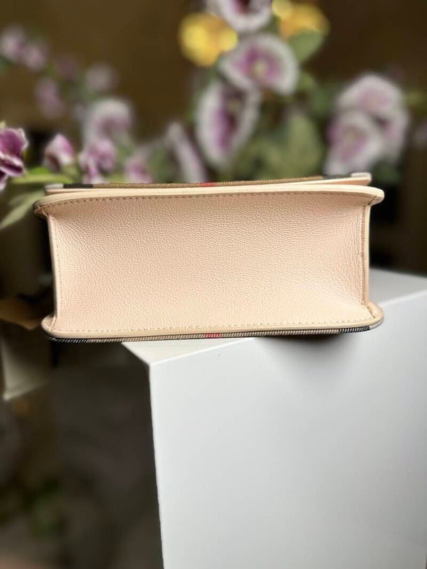 A timeless classic with a modern twist, this Burberry Crossbody Bag is crafted in the house’s signature vintage check canvas with elegant blush pink leather trim. The structured silhouette and compact size make it the perfect everyday companion, while the neutral tones pair effortlessly with any wardrobe. Designed with a magnetic flap closure, this piece opens to a practical interior that fits all your essentials. The detachable strap allows versatile wear, carry it crossbody for casual chic, over the shoulder for hands-free ease, or as a clutch for a refined evening look. Elegant yet functional, this Burberry bag embodies the brand’s heritage craftsmanship and enduring style, making it a must-have addition to any collection.