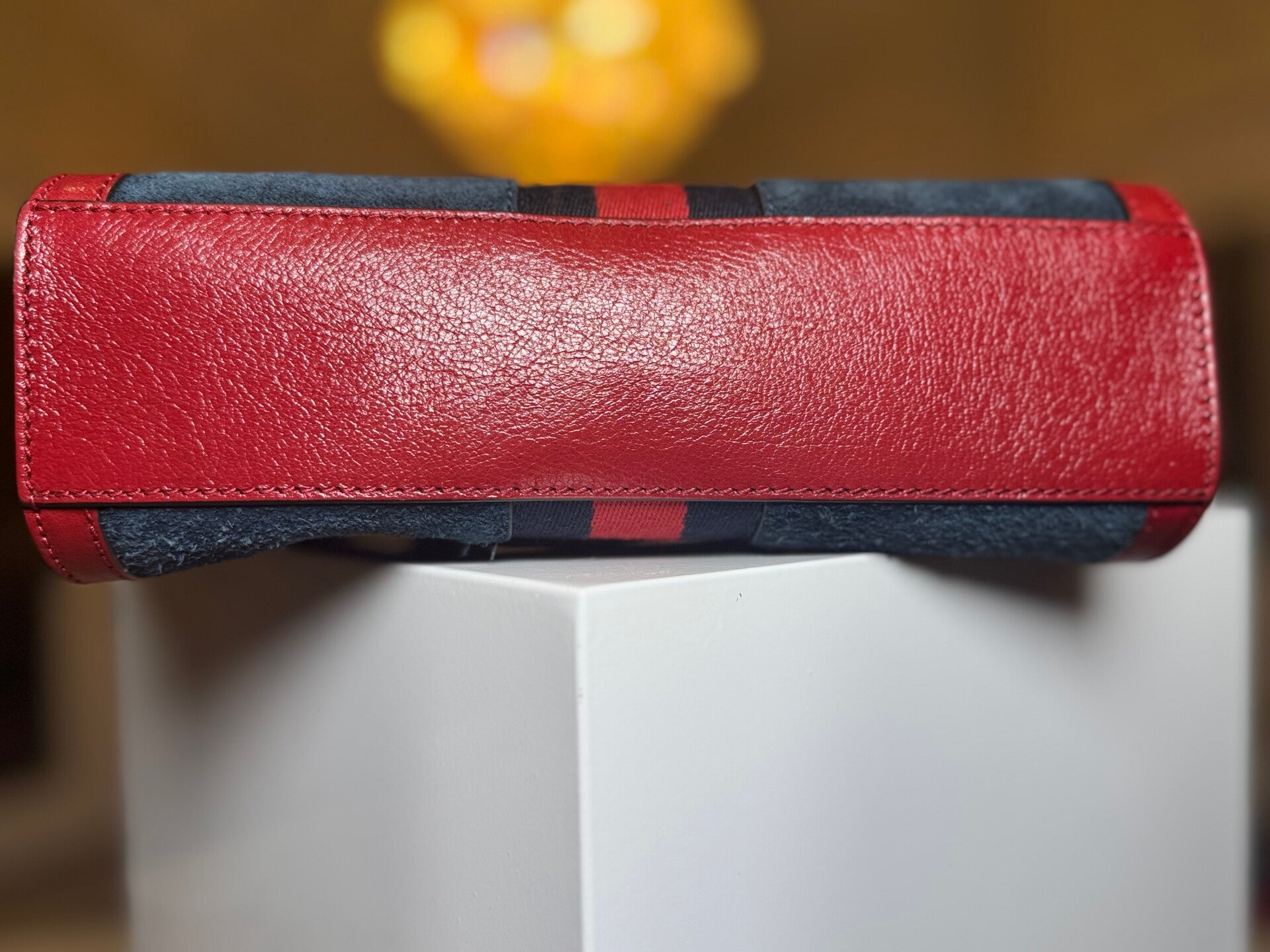 Color: Blue denim with red leather trim