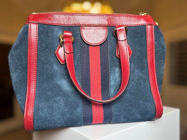 A chic balance of casual and luxury, this Gucci Tote pairs durable blue denim with bold red leather trim and rolled handles. Accented with the classic Gucci logo hardware, it’s roomy enough for daily essentials while keeping a polished look.